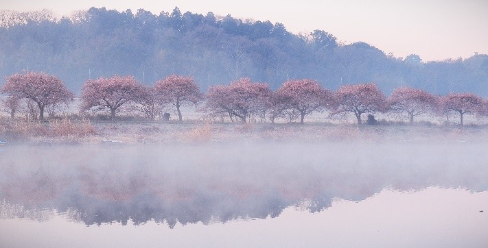 新川の土手に桜が咲き始めた朝、川面には恒例の朝霧がかかった幻想的な雰囲気を見事に撮り上げています。新川の春の最も美しい夜明けの瞬間を写し取った見事な作品です。