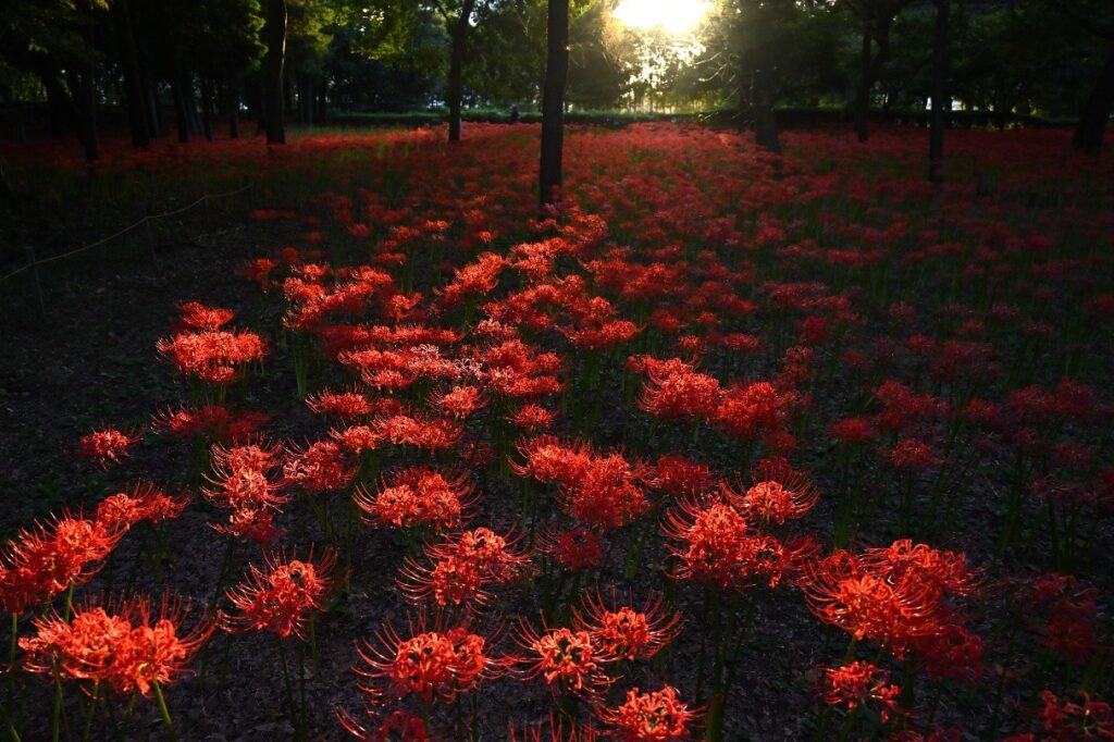 早朝でまだ薄暗い時刻に村上緑地公園に行き、彼岸花の赤と木漏れ日が織り成す