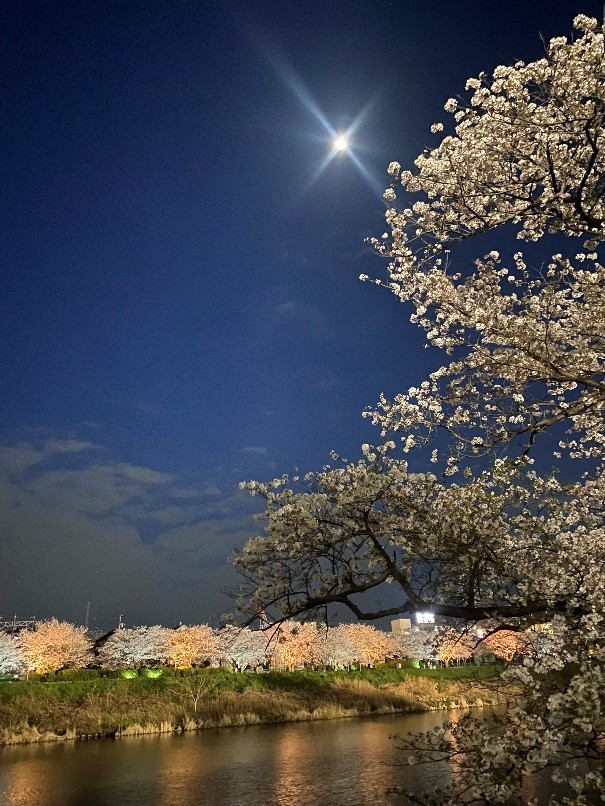 桜が満開の春うらら。春の月夜の限られた光線の中で、鮮明に過不足なく切り撮った見事な写真です。