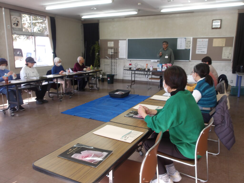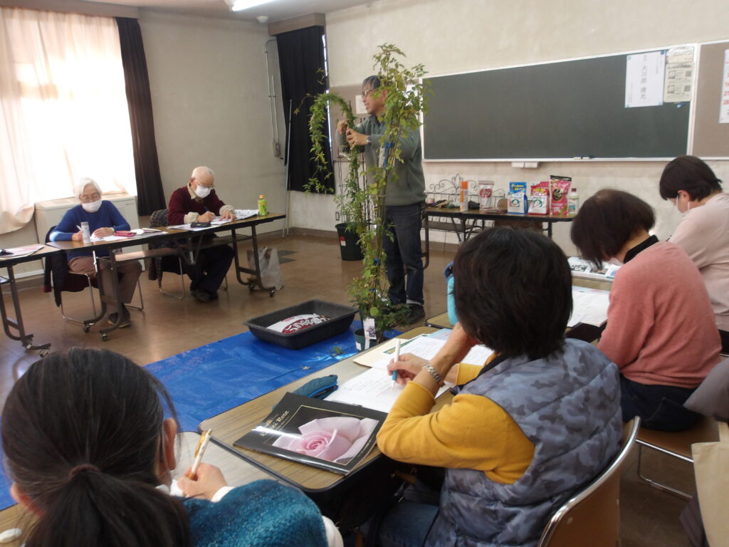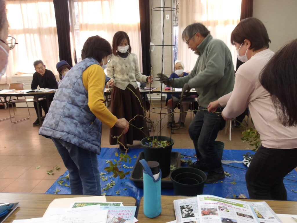 緑の講習会「ツルバラの管理術」 2025年12月23日 最終更新日時 : 2025年12月23日 yachiyo 12月11日㈭勝田台公民館講習室で緑の講習会「ツルバラの管理術」(講師 大川原清光)を開催しました。今回は講義、実演ともすべて講師が行い、参加者が見学するという形でおこないました。始めに講義で、ツルバラの特徴と人気のある品種、お勧めの品種をバラのカタログを参考に学び、バラの用土の説明、植え替え時期、鉢の大きさ、誘引するオベリスクやフェンスを、実物を見せてもらいながら説明をうけました。次に実演として先生がツルバラの苗を大鉢へ植え替えをして、オベリスクへの枝の誘引では受講者の皆さんが枝を広げ、中心に先生がオベリスクを差し込むなど共同で作業をしました。最後に有機肥料、無機肥料の使い方の違い、植え替え時の土の位置など補足説明をしていただき、やや時間を越して終了しました。
