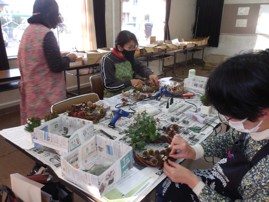 緑の講習会「クリスマスリースとミニ門松づくり」 2025年12月23日 最終更新日時 : 2025年12月23日 yachiyo 12月17日㈬勝田台公民館 講習室で緑の講習会「クリスマスリースとミニ門松づくり」(講師 小髙孝夫)を開催しました。始めにグルーガンになれてもらうため、小さな竹や小枝を組み立てて接着し、そこに生のビャクシンの葉を松に見立てて貼り付け、小さな門松を作りました。ビャクシンの葉を貼ってみたところ、小さな竹が埋もれてしまった方が何人かいまして、先生が少し手を入れてハサミでカットして整えてくれました。次に、ツルをねじったシンプルなリースに、先生が用意した色とりどりの木の実やつる草、ドライリーフをグルーガンで貼り付けオリジナルのクリスマスリースを作りました。今回の作品は多色使いの物や、豊富に木の実やつる草を張り付けた豪華なリースが多かったです。最後に皆さんの作ったクリスマスリースを背後のテーブルに置いて撮影会となり、好評のうちに終了となりました。