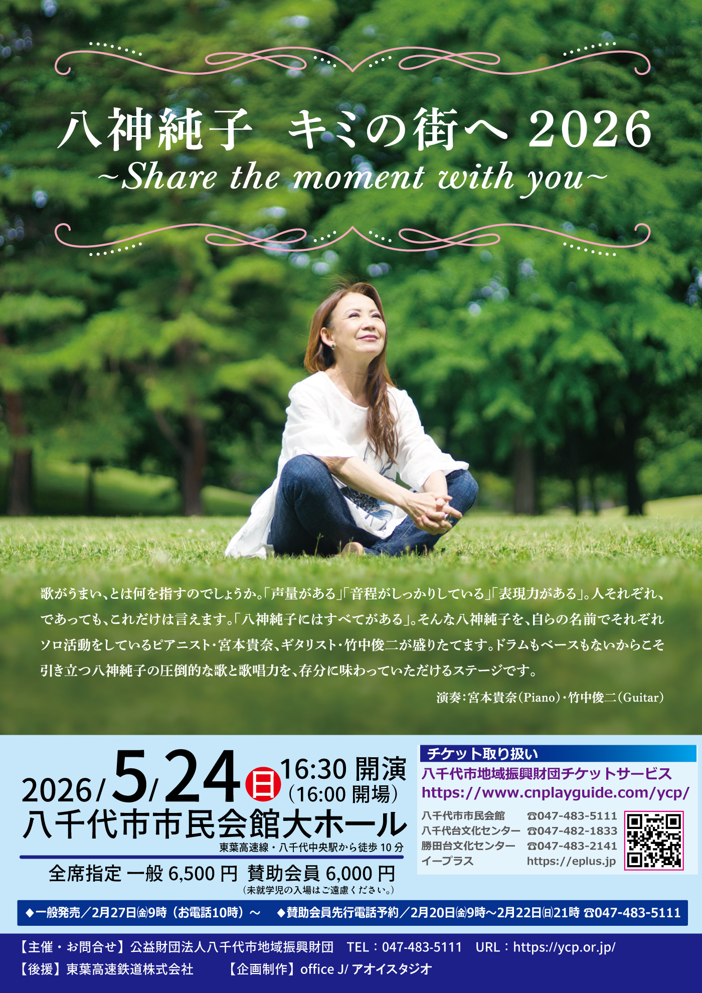 八神純子 キミの街へ 2026 2026年1月23日 最終更新日時 : 2026年1月21日 yachiyo 2026/5/24(日) 八神純子 キミの街へ2026 ~Share the moment with you~ 開催日時 2025年5月22日(木) 18時(開場17時30分) 延期日程及びチケットの取扱いについて 会場 八千代市市民会館 大ホール 料金 【全席指定】一般6,500円、賛助会員6,0 00円 主催 八千代市地域振興財団 後援 東葉高速鉄道株式会社 お問合せ先 八千代市地域振興財団☎047-483-5111 チケット発売 一般発売・・・2月27日(金)9時から(お電話は10時から) 賛助会員先行予約・・2月20日(金)9時~2月22日(日)21時(お電話のみでの受付) 未就学児は入場不可。 駐車可能台数が少ないため、公共交通機関をご利用ください。 ご協力をお願いいたします。 プレイガイド 八千代市地域振興財団チケットサービス https://www.cnplayguide.com/ycp/ 八千代市市民会館 047-483-5111 八千代台文化センター 047-482-1833 勝田台文化センター 047-483-2141